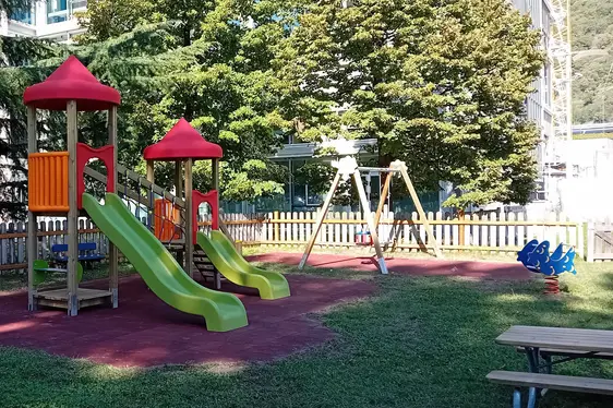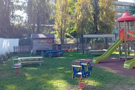 All’esterno i bambini possono usufruire di un giardino per i giochi all’aperto.