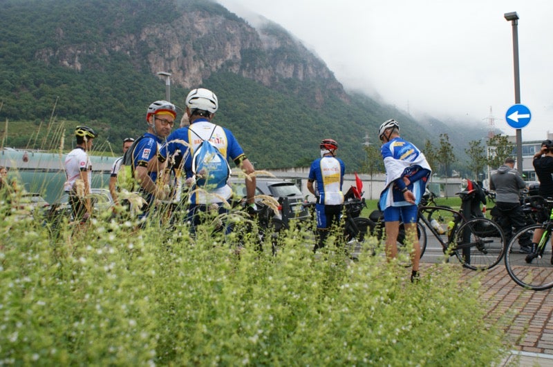 Nach einer kurzen Erfrischung setzten die Teilnehmerinnen und Teilnehmer der Euregiotour für Transplantation heute ihre Fahrt fort. Sanitätsdirektor Josef Widmann ließ es sich nicht nehmen, die Gruppe mit seinem Rennrad bis auf den Mendelpass zu begleiten.