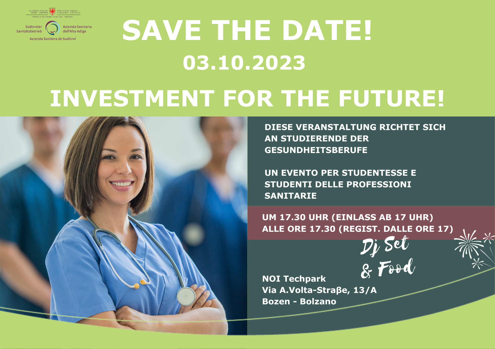 „Wir möchten die Gelegenheit nutzen, uns mit Freude der neuen Generation, die im Gesundheitsbereich arbeiten möchte, zu öffnen. Wir müssen lernen, ihre Bedürfnisse zu erkennen und auf all ihre Fragen zu antworten“, so Marianne Siller, Pflegedirektorin des Südtiroler Sanitätsbetriebes. „Die Veranstaltung ‚Investment for the future‘ ist der richtige Anlass, um uns kennen zu lernen und zu zeigen, dass es im Sanitätsbetrieb unglaublich viele Möglichkeiten gibt, sich beruflich weiterzuentwickeln und Karriere zu machen.“